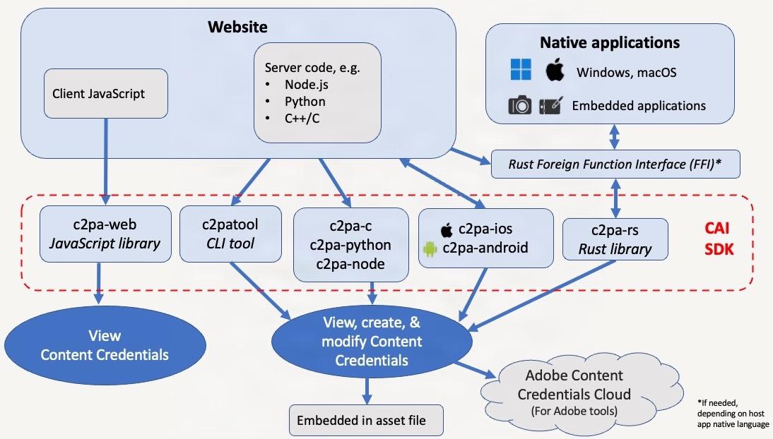 - C/C++, Python, Node.js libraries that enable applications to read and validate manifest data, create and sign manifest data and embed it supported asset files.